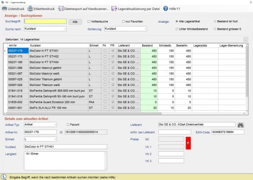 - Listendruck der Lagerliste